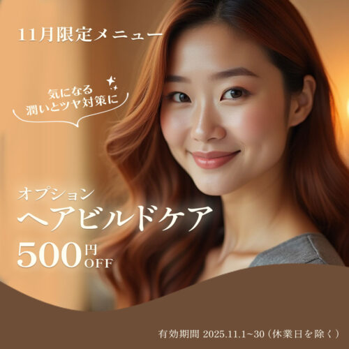内容:他メニューご利用時のオプションヘアビルドケア500円OFF(通常価格4000円)